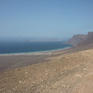 Wir kommen an einem alten Kalkmörtelbrennofen vorbei und wandern leicht ansteigend auf einer breiten Erdpiste auf einen Bergrücken. Wir bestaunen die erste grandiose Aussicht auf das gewaltige Risco de Famara Massiv und die nördlich vorgelagerten Inseln. In einem Bergsattel beginnt der Hauptabstieg auf einem kleinen, Jahrhunderte alten Pfad, leicht schräg abfallend durch ein Dutzend kleiner und größerer Erosionsrinnen. Den Blick haben wir nun immer auf das kleine Fischerdorf Caleta de Famara gerichtet.